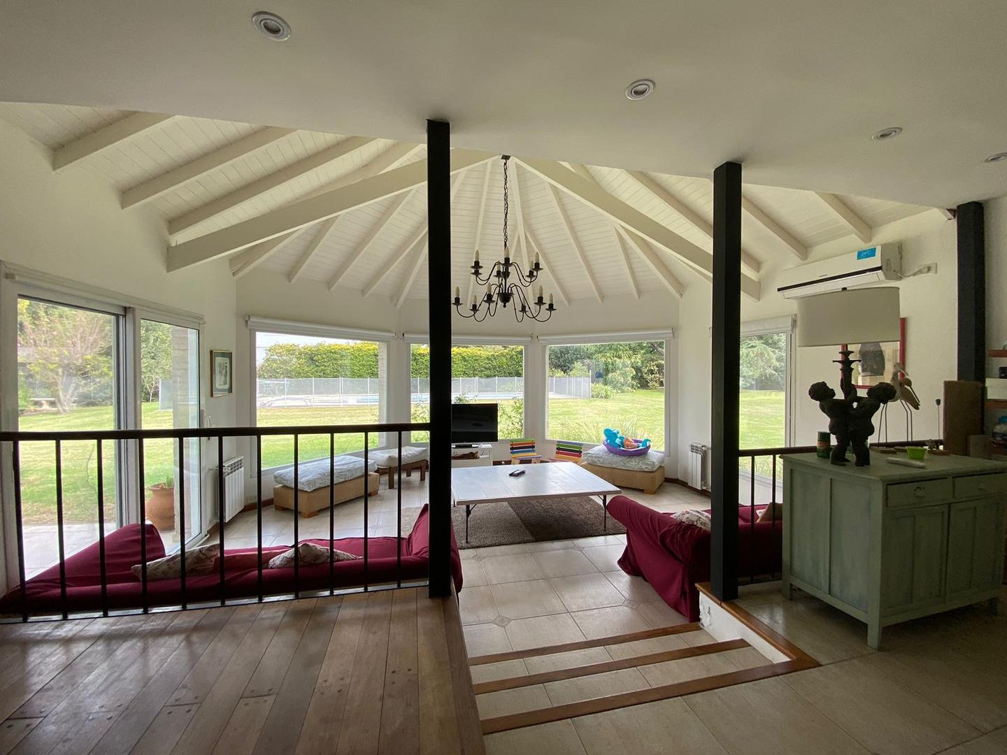 Hall de entrada. Amplio y luminoso living con hogar salida a galería. Luminoso comedor en desnivel con ventanas al frente. El mismo cuanta con doble circulación desde el hall de entrada y el living. Toilette. Divino estar/playroom con ventanales con vistas de 180 grados al verde del jardín. Amplia cocina abierta a luminoso comedor diario con vista al jardín. Entrada de servicio. Sector de lavadero con baño de servicio con salida al jardín (sector de tender). Despensa. Luminoso dormitorio con placard y vista al jardín. Dormitorio con vestidor y vista al jardín. 3er Dormitorio u escritorio con placard.